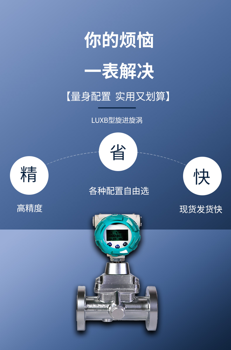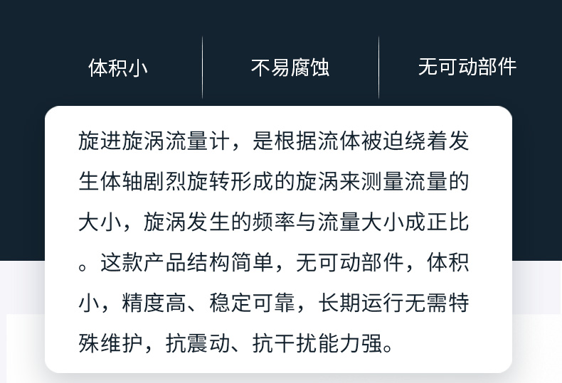 旋進旋渦流量計,是根據流體被迫繞著發生體軸劇烈旋轉形成的旋渦來測量流量的大小,旋渦發生的頻率與流量大小成正比。這款產品結構簡單,無可動部件,體積小,精度高、穩定可靠,長期運行無需特殊維護,抗震動、抗干擾能力強。
